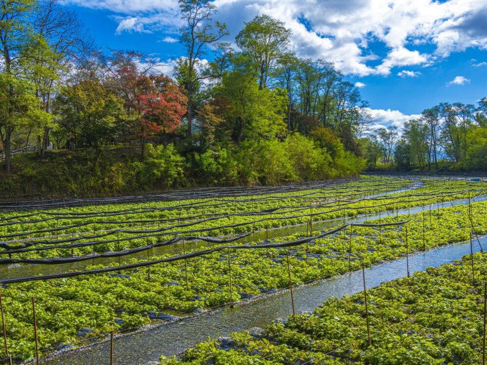 Have you ever tried fresh wasabi? Daio Wasabi Farm, located in Azumino, Nagano Prefecture, is a popular tourist destination. Within its spacious grounds, you’ll find wasabi fields nourished by the pure spring water from the Northern Alps, charming waterwheels, and an observation deck with a panoramic view of the Southern Alps. You can also enjoy their specialty wasabi soft-serve ice cream and soba noodles at the on-site restaurant.