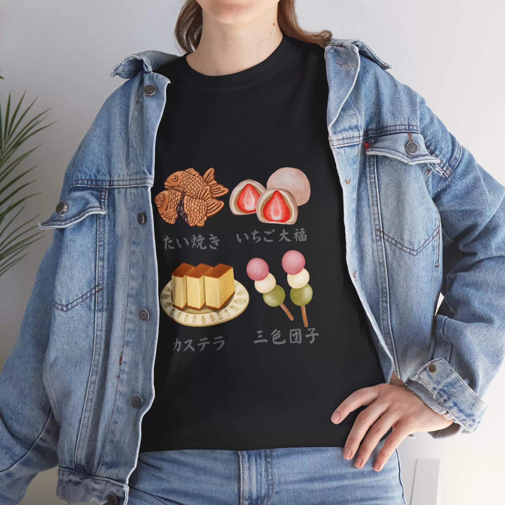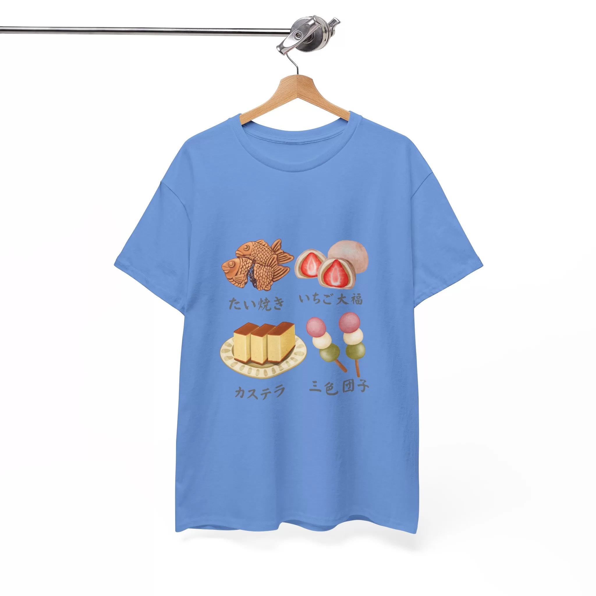 Indulge in four iconic Japanese treats—Taiyaki, Castella, Strawberry Daifuku, and Three-Colored Dango—with their names in Japanese. The ultimate cotton tee for Japan lovers and dessert enthusiasts!