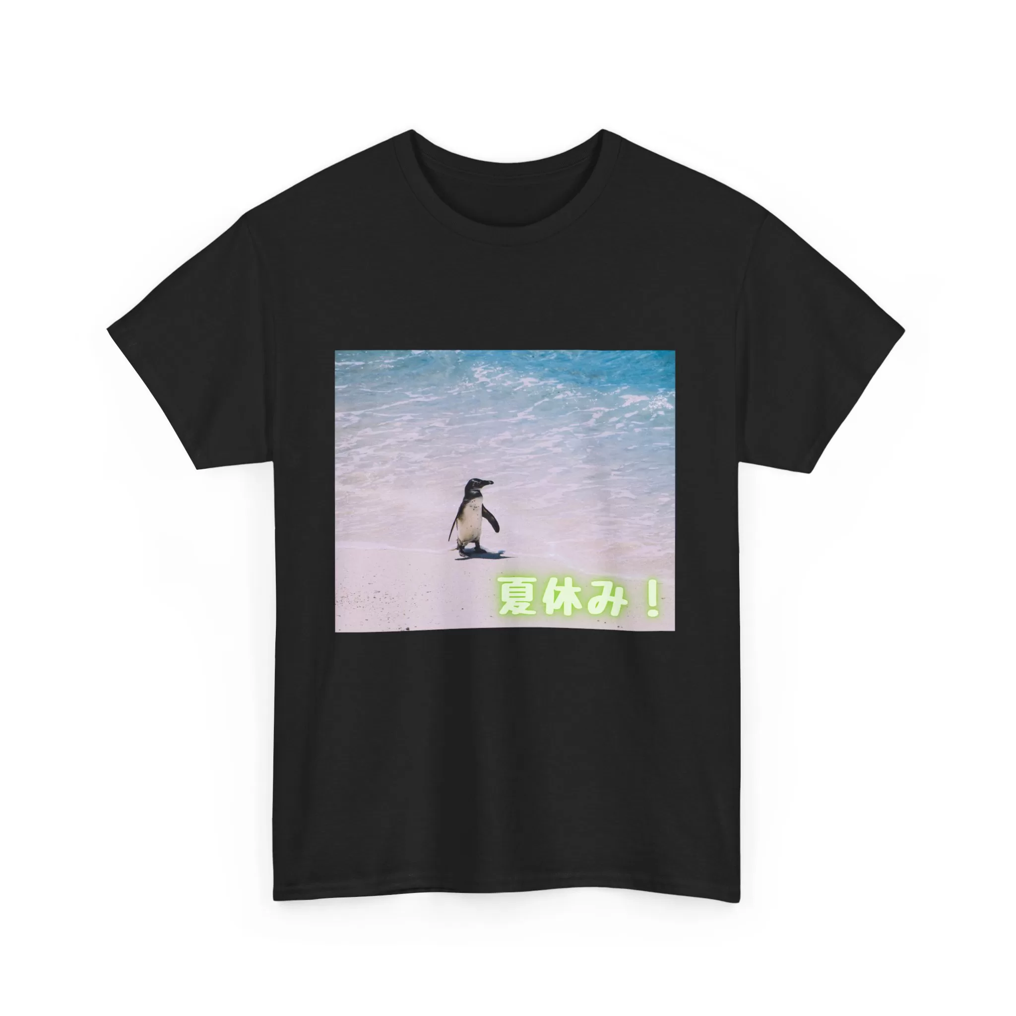Right below the scene, the bold Japanese kanji “夏休み” (Natsuyasumi – “Summer Vacation”) adds a playful touch that makes this tee burst with summer vibes!
